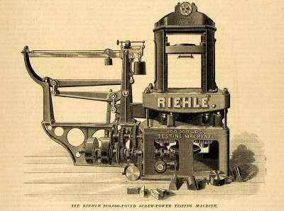 在中國(guó),杠桿式拉伸試驗(yàn)機(jī)被引進(jìn)大概是在上世紀(jì)初,同濟(jì)大學(xué)建設(shè)初期,引進(jìn)一臺(tái)同濟(jì)編號(hào)為:440001的杠桿式拉伸試驗(yàn)機(jī)(圖二),目前,存放于同濟(jì)大學(xué)力學(xué)試驗(yàn)中心。這臺(tái)試驗(yàn)機(jī)上同時(shí)標(biāo)有“RIEHLE BRCXPHILA16494”(圖三)的小字,通過(guò)檢索,發(fā)現(xiàn)這臺(tái)試驗(yàn)機(jī)是由位于美國(guó)費(fèi)城的理勒兄弟測(cè)試機(jī)械公司(Riehle Brothers Testing machines Company)生產(chǎn)。